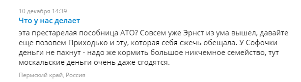 “Ця стара посібниця АТО? Зовсім вже Ернст з розуму вийшов, давайте ще погукаємо Приходько і цю, яка себе спалити обіцяла”, – пишуть росіяни.