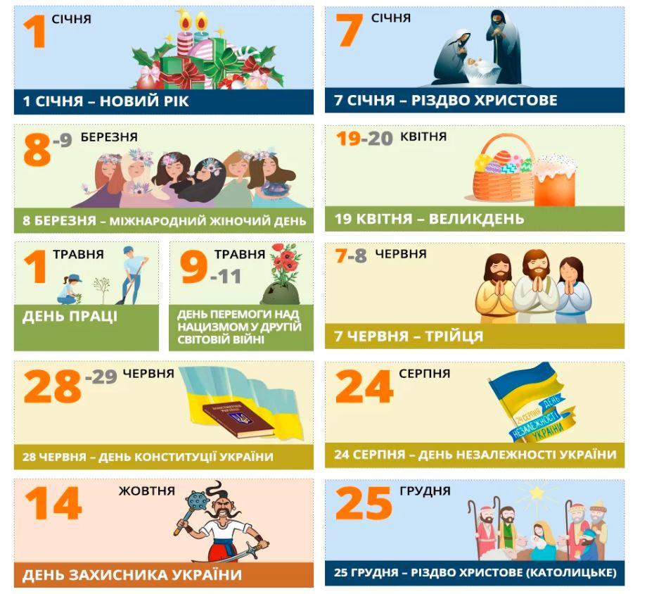 Загалом у календарі на 2020 рік передбачається 11 офіційних вихідних: 1 січня – Новий рік (середа), 7 січня – Різдво Христове за юліанським календарем (вівторок), 8 березня – Міжнародний жіночий день (неділя), 19 квітня – Великдень (неділя), 1 травня – Міжнародний день праці (п’ятниця), 9 травня – День перемоги над нацизмом у Другій світовій війні (субота), 7 червня – День Святої Трійці (неділя), 28 червня – День Конституції України (неділя), 24 серпня – День незалежності України (понеділок), 14 жовтня – День захисника України (середа) і 25 грудня – Різдво Христове за григоріанським календарем (п’ятниця).