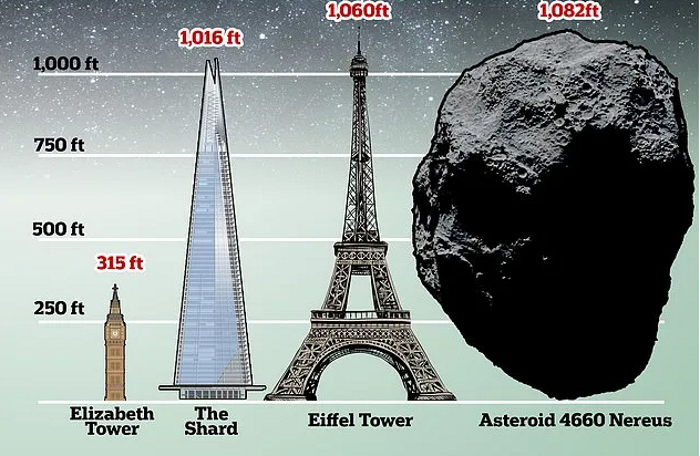 Слід зазначити, що цей астероїд, який фігурує під назвою 4660 Nereus, класифіковано як “потенційно небезпечний”, адже його довжина складає 330 м, що співмірно з розміром Ейфелевої вежі. Тим не менше, він пролетить на достатньо великій відстані, щоб не нести ризиків для Землі.