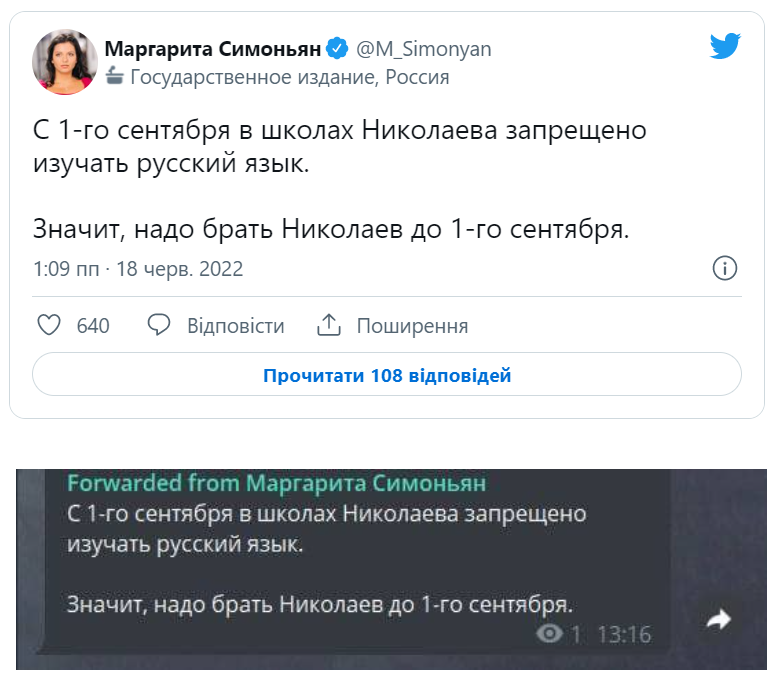 Реакція Росії не змусила себе довго чекати. Відома російська пропагандистка Маргарита Симоньян заявили, що потрібно захопити Миколаїв раніше. Допис із погрозою вона опубликувала у своїх соцмережах.