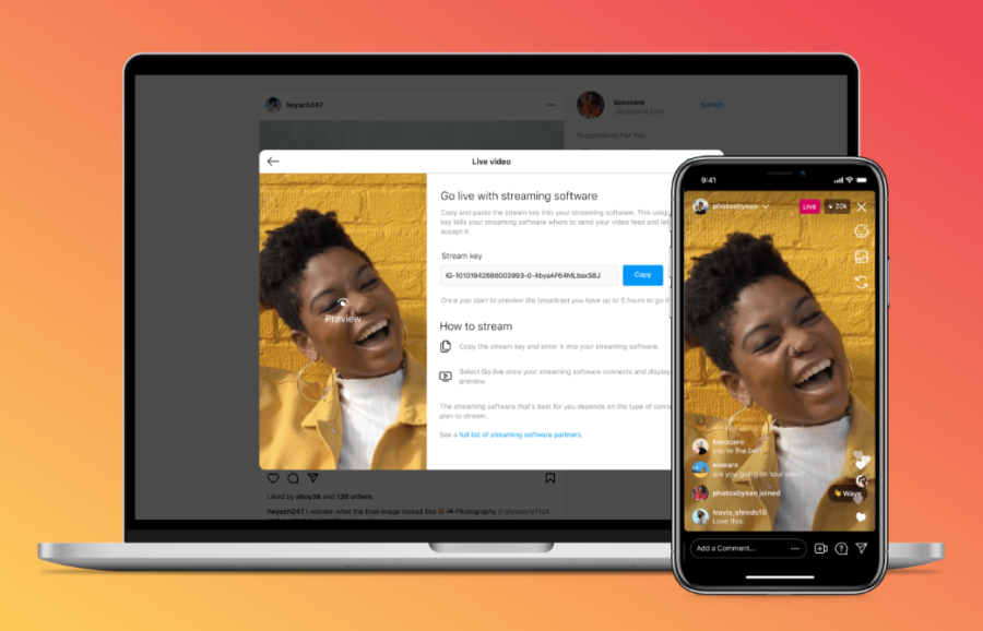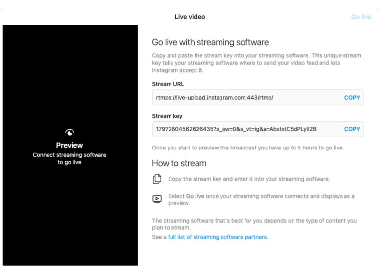Функція називається Live Producer. Для створення прямого ефіру використовують OBS або Streamlabs. Instagram видає URL та ключ стріму, після чого з’являється кнопка “Створення публікації” та вибір потокової передачі. Режим дозволяє вибирати аудиторію та переглядати коментарі.