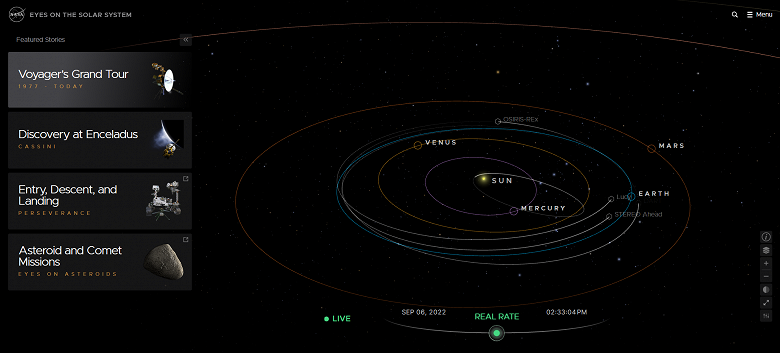 Американська космічна агенція NASA випустила нову версію Eyes on the Solar System. Це інтерактивна карта Сонячної системи, яка дозволяє досліджувати планети, місяці, астероїди, комети та космічні кораблі за період із 1950 по 2050 рік. Інакше кажучи, вона дозволяє буквально поглянути у майбутнє, хоч би на кілька десятиліть.