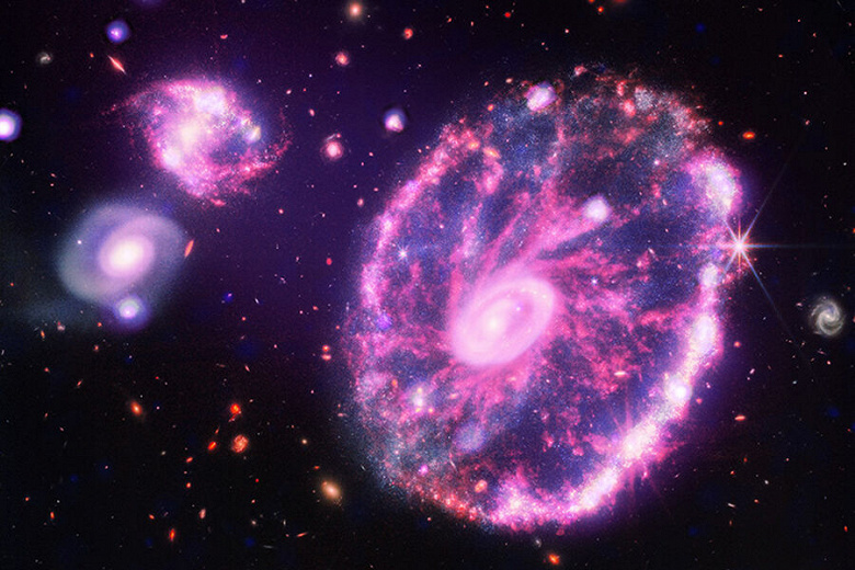 Об’єднані зображення зроблені в штучних кольорах, фіолетовим кольором відображені рентгенівські джерела, а рештою те, що зняв «Джеймс Вебб». Серед іншого астрономи продемонстрували вигляд галактики Колесо воза та Туманність Каріна.