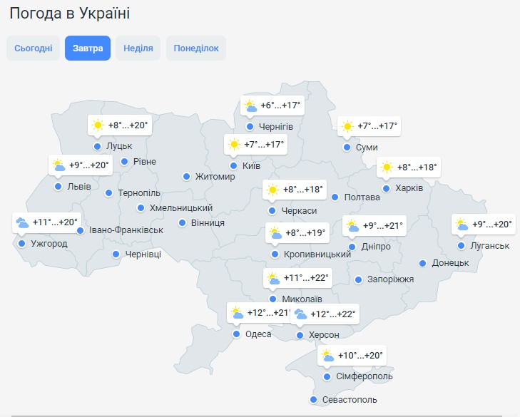 Так, 8 жовтня в Україні буде сухо, сонячно та тепло — вдень очікується +15+20 градусів тепла. Місцями, зокрема у Миколаївській, Одеській та Херсонській області, буде до +22 градусів тепла.