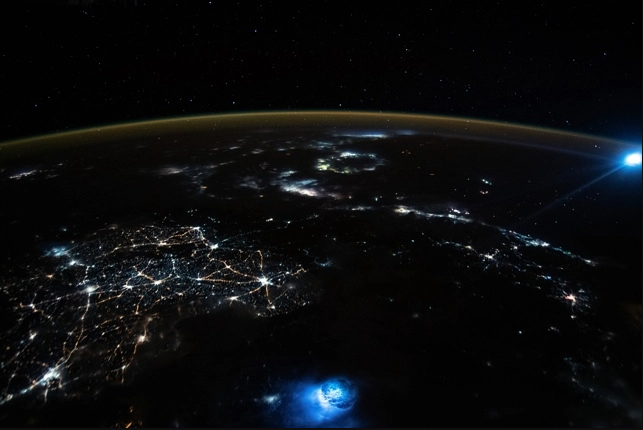 Перша пляма світла, яку видно внизу зображення, — це потужний удар блискавки десь у Сіамській затоці.