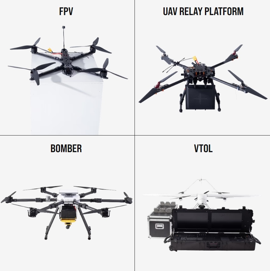 - VTOL — безпілотник з вертикальним зльотом та посадкою для ведення розвідки в умовах, де відсутній простір для класичного зльоту. Його робоча висота — до 3 500 метрів.