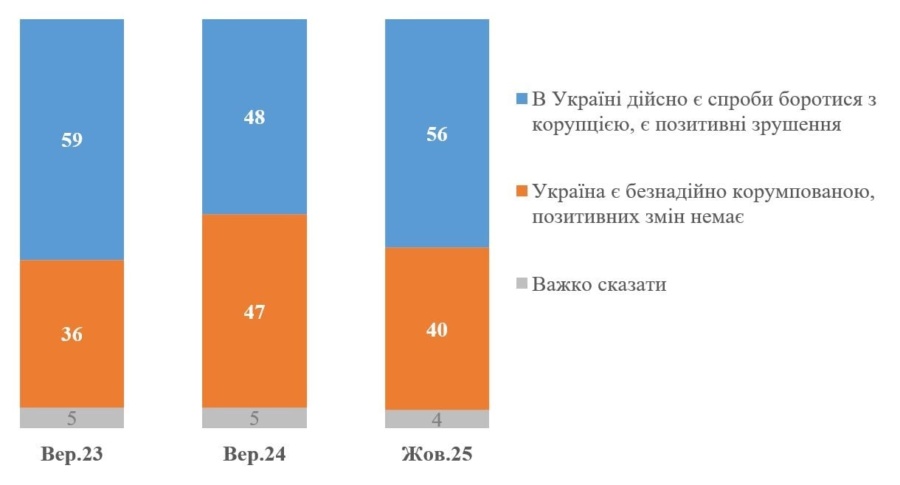 - 56% респондентів вважають, що в Україні дійсно є спроби боротися з корупцією. Це зростання порівняно з 2024 роком (48%).