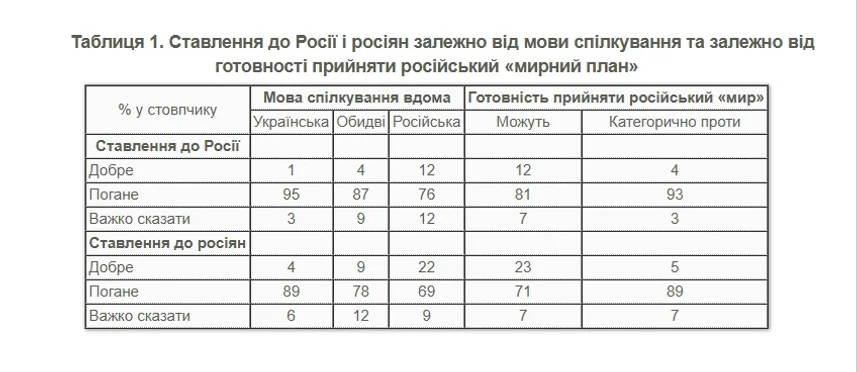 Лише 12% російськомовних українців добре ставляться до росії, і 22% — до росіян. Серед тих 17% українців, які у вересні 2025 року були готові прийняти російський «мирний план» (фактичну капітуляцію), лише 12% добре ставляться до росії.