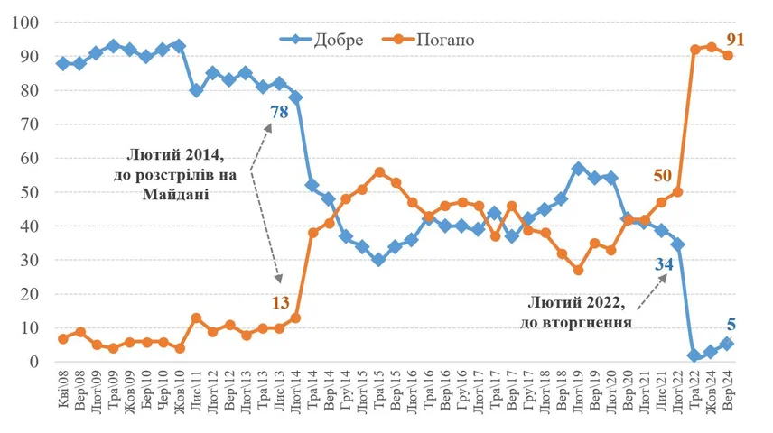 Загальне ставлення до росії в Україні залишається абсолютно негативним: від 92% на заході до 80% на сході країни. Динаміка опитувань з 2008 року свідчить, що погіршення ставлення до рф завжди відбувалося як наслідок агресивних дій самої росії.