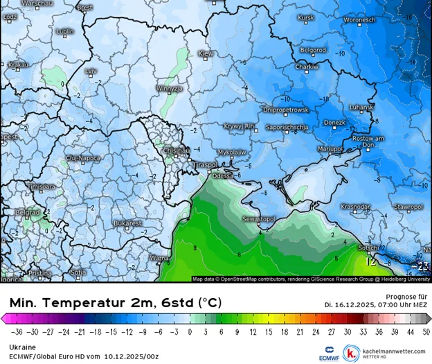 Згодом, під впливом антициклону, повітря стане більш сухим і холодним — передусім у східних та частині центральних регіонів. Найвідчутніші морози, за прогнозом Кибальчича, очікуються в ніч на 16 грудня. У Дніпропетровській та східних областях температура може знизитися до –9…–12 °C. На Правобережжі та півдні країни мороз буде слабшим і переважно нічним.