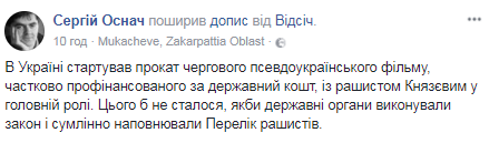 “Главную роль в нем сыграл российский актер Евгений Князев, который в 2014 году подписал обращение российских деятелей культуры в поддержку путинской политики в отношении Украины – то есть фактически одобрил агрессию и оккупацию. Большинство главных ролей в фильме играют россияне, в частности, Андрей Кайков, который недавно незаконно гастролировал в оккупированном Крыму”, – сказано в сообщении гражданского движения “Відсіч”.