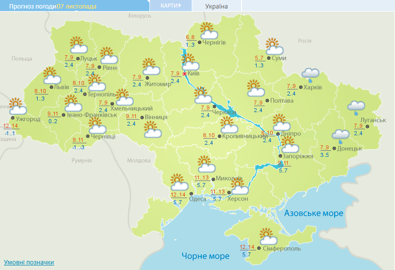 Так, у вівторок, 7 листопада, опади у вигляді дощу пройдуть очікуються тільки в Луганській і Донецькій областях.