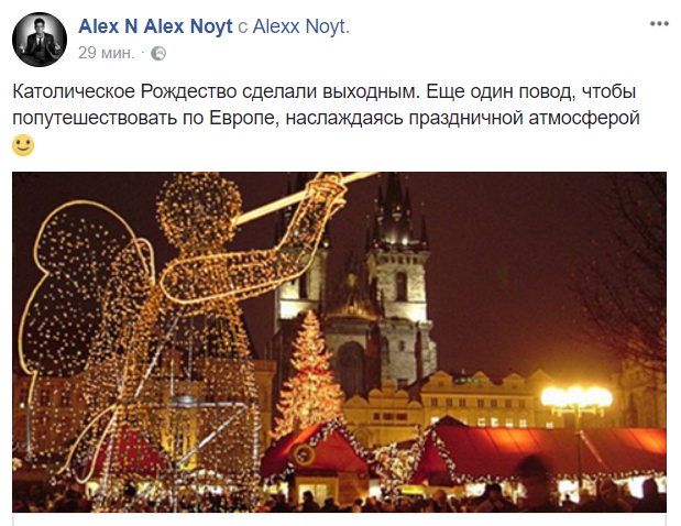 “Католицьке Різдво зробили вихідним. Ще один привід, щоб помандрувати по Європі, насолоджуючись святковою атмосферою”, – пише волонтер і блогер Алекс Нойт.