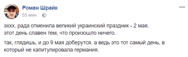 “Еххх. Рада скасувала велике українське свято – 2 травня. Цей день славний тим, що сталося нічого. Так, дивись, і до 9 травня доберуться. Але ж це той самий день, в який не капітулювала Німеччина”, – зазначає журналіст Роман Шрайк .
