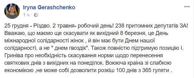 “25 грудня – Різдво. 2 травня – робочий день! 238 притомних депутатів ЗА! Вважаю, що у нас ще треба скасувати як вихідний 8 березня, це День міжнародної солідарності жінок, і він повинен бути Днем нашої солідарності, а не “днем ​​гвоздик”. Також повністю підтримую позицію Ігоря Гриніва про необхідність скасування норми про перенесення святкових днів з вихідних на понеділок. Воююча країна зі слабкою економікою не може собі дозволити розкіш 100 днів із 365 гуляти”, – пише перший віце-спікер Верховної Ради Ірина Геращенко.