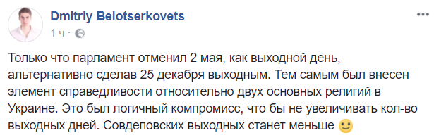“Щойно парламент скасував 2 травня, як вихідний день, альтернативно зробивши 25 грудня вихідним. Тим самим був внесений елемент справедливості щодо двох основних релігій в Україні. Це був логічний компроміс, що б не збільшувати кількість вихідних днів. Совдепівських вихідних стане менше”, – вважає радник мера Києва Дмитро Білоцерківець.