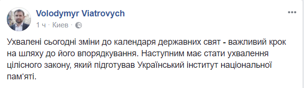 “Прийняті сьогодні зміни в календар державних свят – важливий крок на шляху до його впорядкування. Наступним має стати прийняття цілісного закону, який підготував Український інститут національної пам’яті”, – вважає директор УІНП Володимир В’ятрович.