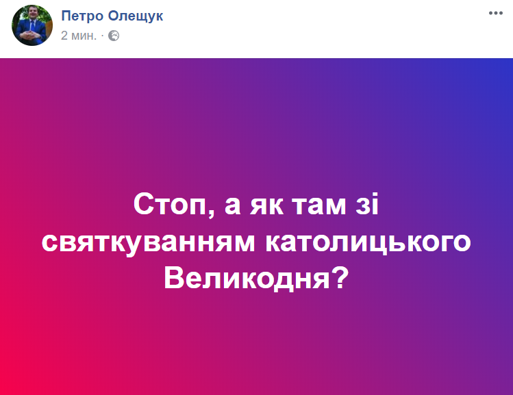 “Стоп, а як там зі святкуванням католицького Великодня?” – цікавиться політолог Петро Олещук.