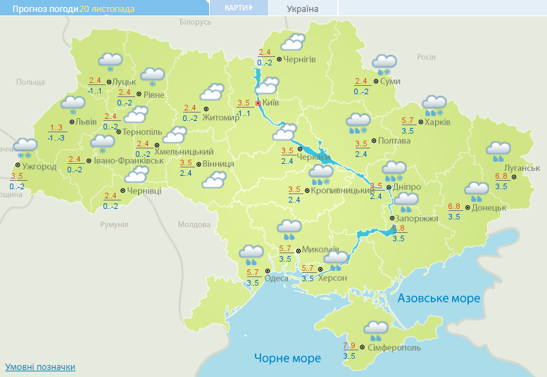 У понеділок, 20 листопада, в більшості центральних, а також у східних областях очікуються дощі, місцями з мокрим снігом.