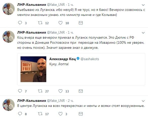 Інші блогери вирішили поіронізувати на тему річниці Майдану, дій “української ДРГ”, а також можливості таких подій в Україні, в разі спроби зняти з посади голову МВС Арсена Авакова. Також коментатори запропонували просто спостерігати за тим, як терористи перестріляють одне одного.