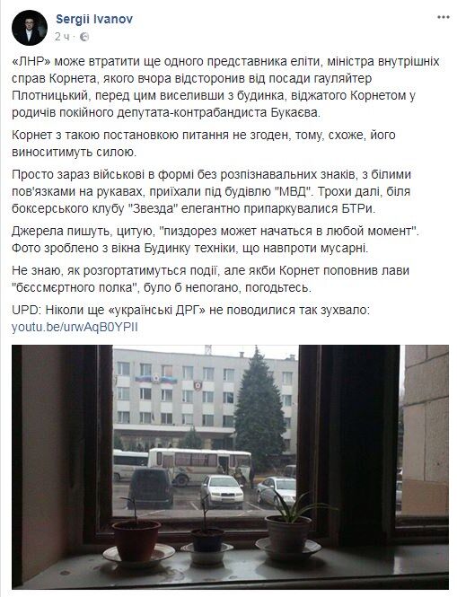 За наявною інформацією це пов’язано з конфліктом між ватажком “ЛНР” Ігорем Плотницьким і відстороненим ним від посади”голови МВС” Ігорем Корнетом.