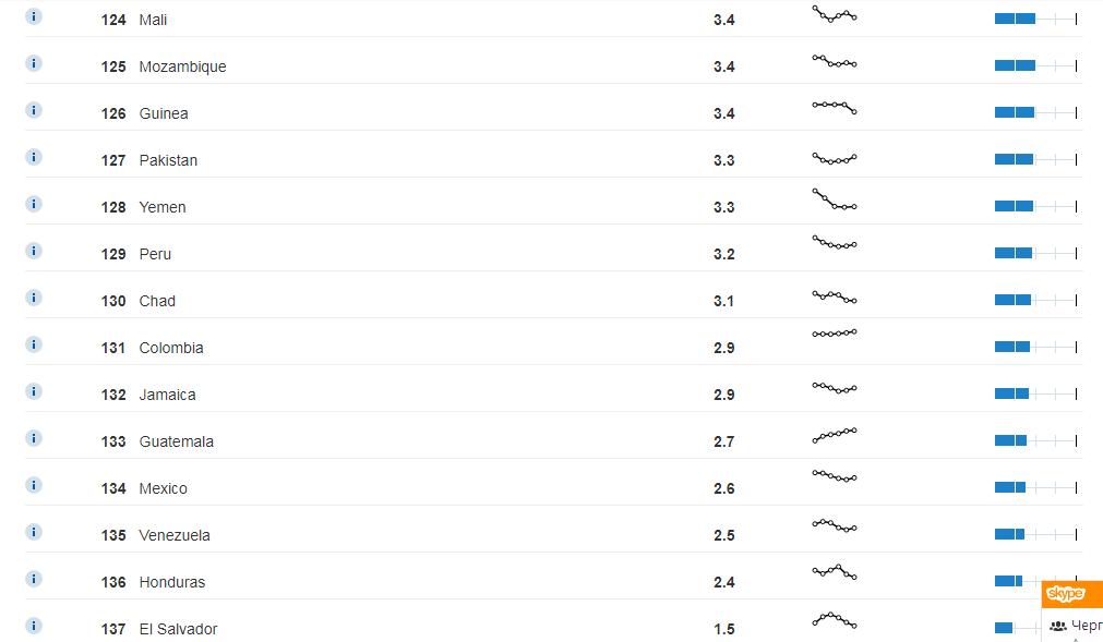 Україна зайняла 113 місце серед 137 країн світу, отримавши загальну оцінку 3,9 бала з 7 можливих.