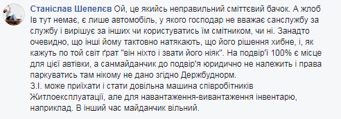 “Жлобів тут немає, є тільки автомобіль, у якого господар не вважає Санслужбу за службу і вирішує за інших користуватися смітником чи ні. Занадто очевидно, що інші йому тактовно натякають, що його рішення помилкове, і, як кажуть по той світ решітки “він ніхто і звати його ніяк”, – написав він.