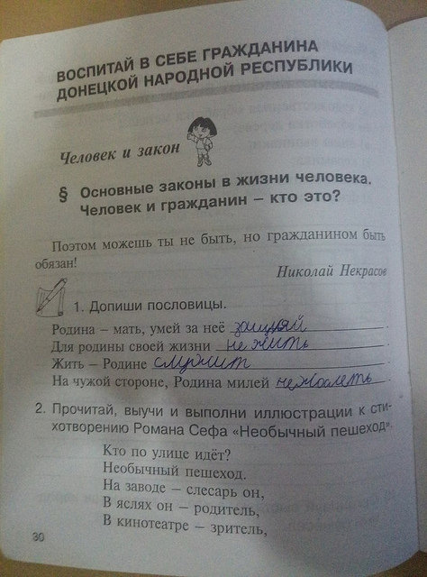 Про це повідомив блогер Pauluskp і опублікував скріншоти з посібника для учнів 2-го класу “Уроки громадянськості Донбасу”. Зокрема, один із розділів посібника називається “Донбас і русскій мір”.