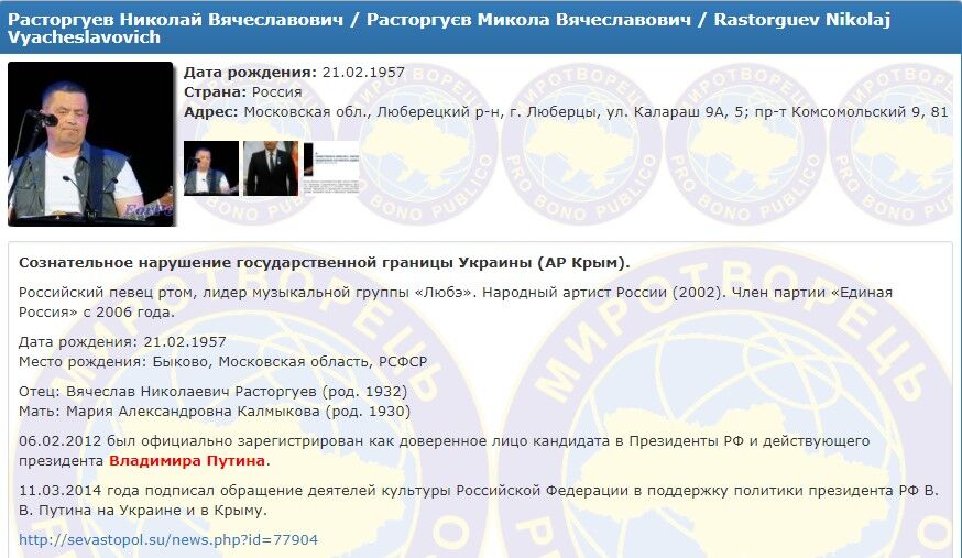 Російський співак Микола Расторгуєв, лідер групи “Любе” потрапив у базу злочинців українського волонтерського центру “Миротворець”, який фіксує злочини проти національної безпеки України.