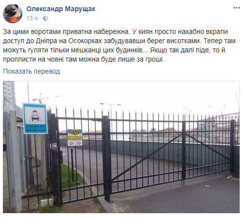 “За цими воротами приватна набережна. У киян просто нахабно вкрали доступ до Дніпра на Осокорках, забудувавши берег висотками. Тепер там можуть гуляти тільки жителі цих будинків”, – написав він.