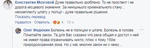 “Хвороба не в поліції і штаті. Хвороба в голові. Почитайте закон. Там для вас сказано, що річка загальна і доступ до неї не має права обмежувати ніхто, плюс до того 150 м природоохоронна зона. Але у нас багатьом закон ні до чого”, – заперечив він.