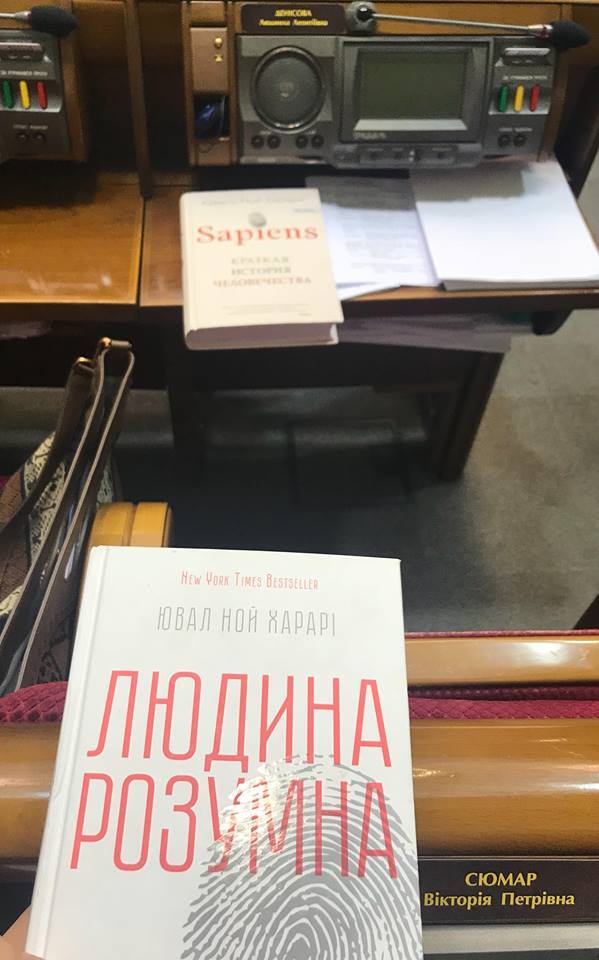 “Що читають у Раді? Ми з колегою Людмилою Денисовою – випадково одну й ту ж книгу, тільки різні видання. “Людина Розумна” від Юваль Харарі в залі українського парламенту, де взагалі дуже мало людей”, – написала депутат.