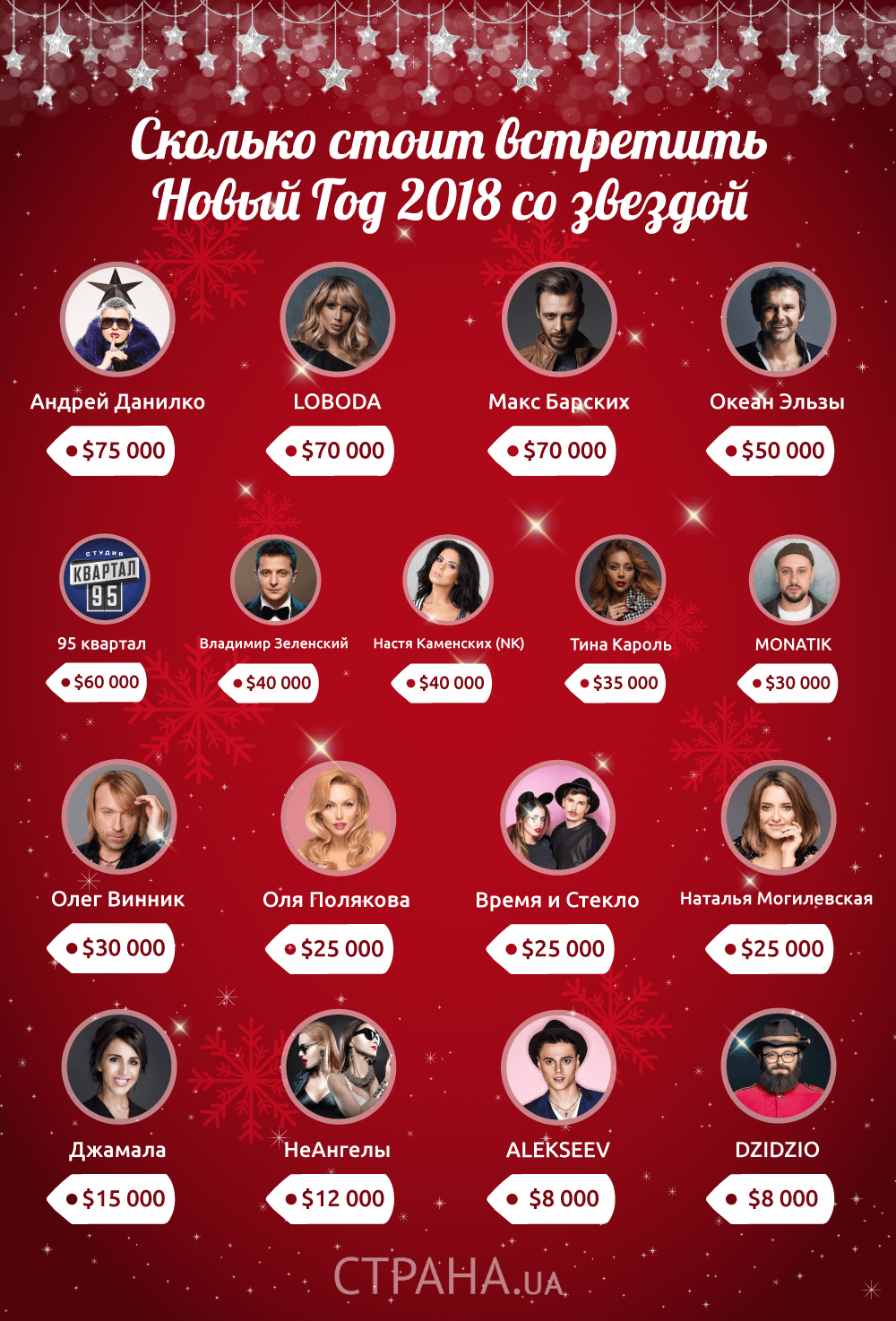 “Подешевела Джамала – $15 000 за час (в прошлом году стоила $20 000 – Прим.Ред). Прошла уже волна после “Евровидения“, да и она ждет ребенка. Не факт, что согласится выступать на любом новогоднем зажигательном пати. Интересуются DZIDZIO, но он цену не заламывает, согласен выступить за $8000. Кстати, вот ALEKSEEV по прежнему в фаворе. Его гонорар от $8000 до $10 000“, – подытоживает эксперт.