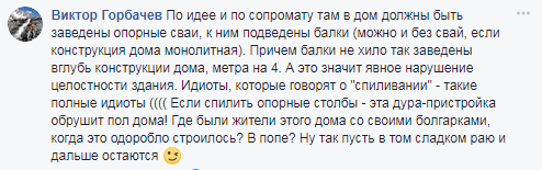 “Причому балки не мало так заведені вглиб конструкції будинку, метри на 4. А це означає явне порушення цілісності будівлі. Ідіоти, які говорять про “спилювання” – таки повні ідіоти. Якщо спиляти опорні стовпи, ця дура-прибудова обрушить півбудинку!” – підкреслив він.