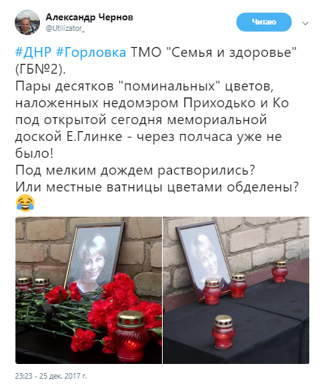 “Пари десятків “поминальних” квітів, накладених недомером Приходько і Ко під відкритою меморіальною дошкою Е. Глінці, – через півгодини вже не було!” – наголосив він.