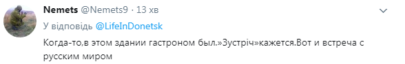 “Кафе “Зустрiч”, мать його. Працював “у билинні часи” в цій будівлі. Ну, шо-ж. Як-гриться “за що боролися – на те й напоролися”. Не треба “трагедії” з цього “будувати”. у Донбасі – вже давно закривалися шахти та цілі селища лежали в руїнах”, – написав Ігор Головков.