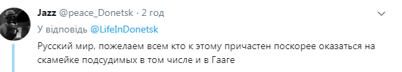 “Русский мир”, побажаємо всім хто до цього причетний скоріше опинитися на лаві підсудних у тому числі й у Гаазі”, – заявили в мережі.
