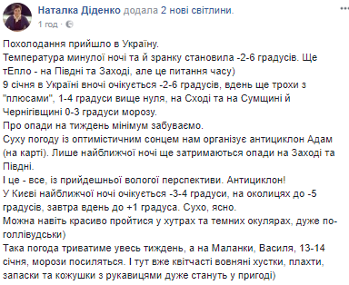 “У Києві найближчої ночі очікується -3-4 градуси, в околицях до -5 градусів, завтра вдень до +1 градуса. Сухо, ясно”, – пише Діденко.