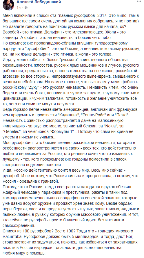“Мене включили до списку ста головних русофобів -2017. Це мило, там в більшості своїй дуже гідна компанія зібралася, я не проти. Але давайте говорити зрозумілою російською мовою для початку. Воробей – це пташка. Дельфін – це ссавець. Ду*а – це зад*иця. а фобія – це не ненависть, а боязнь чогось. Але кремлівські пропагандоно-е*лани вселили туподовірливому народу, що “русофобія” – це не боязнь, а ненависть до всього російського, тобто їх мовою дельфін – це пташка, а ду*а – це голова”, – заявив він.