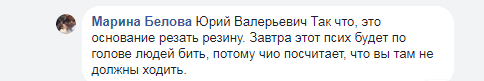 “Так що, це підстава різати гуму. Завтра цей псих буде по голові людей бити, тому що вважатиме, що ви там не повинні ходити”, – обурилася Марина Бєлова.