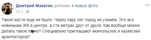 “Такої жерсті ще не було. Через пару років місто не впізнаємо. Це все новенькі ЖК у центрі, за сто метрів один від одного. Як взагалі можна робити таке л*йно? Спеціально запрошують монгольських і казахських архітекторів?” – запитав він.