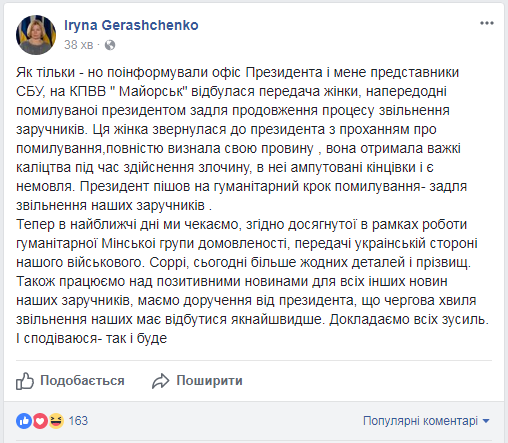 “Як щойно проінформували офіс президента і мене представники СБУ, на КПВВ “Майорськ” відбулася передача жінки, напередодні помилуваної президентом для продовження процесу звільнення заручників”, – розповіла вона.