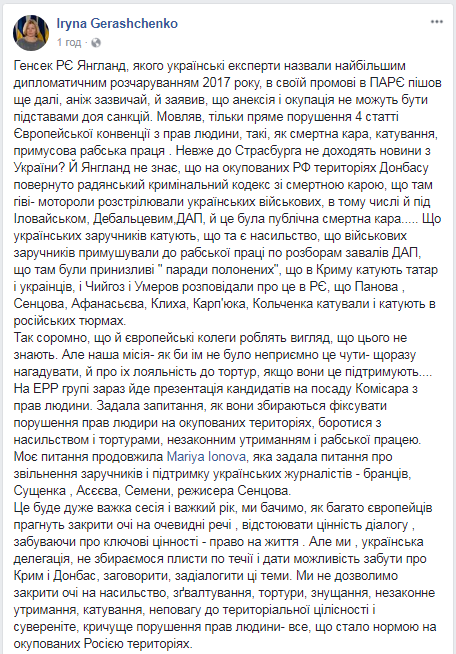 “Ягланд, якого українські експерти назвали найбільшим дипломатичним розчаруванням 2017 року, в своїй промові в ПАРЄ пішов ще далі, ніж зазвичай, і заявив, що анексія і окупація не можуть бути підставами для санкцій”, – нагадала вона.