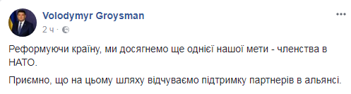 “Гарна новина! Вітаю всіх! Україні надано статус країни-аспіранта на вступ у НАТО! Щиро радий і гордий тим, що ініційоване мною рішення Верховної Ради від 8 червня 2017 року щодо членства України в НАТО як стратегічної мети України, стало для цього ключовим імпульсом. Ми, крок за кроком, незворотньо ідемо до нашої мети. Україна буде в НАТО!” – написав він.