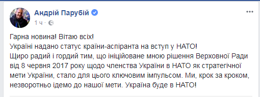 Голова Верховної Ради Андрій Парубій також поділився в соцмережі радісною звісткою, привітавши всіх з визначенням статусу України в НАТО.