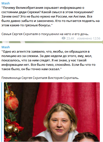 Також на каналі наводяться слова неназваних членів сім’ї Скрипаля, де вказується, що його отруєння “не було потрібно ні Росії, ні Англії”.