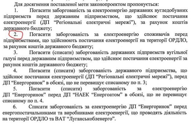 Міністерство енергетики та вугільної промисловості пропонує погасити заборгованість за електроенергію споживачів перед підприємствами, що здійснюють постачання на території ОРДЛО, за рахунок коштів державного бюджету України.