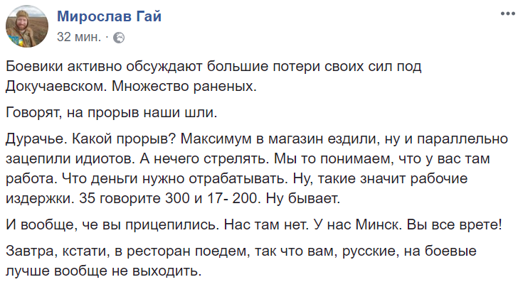 “Бойовики активно обговорюють великі втрати своїх сил під Докучаєвськом. Безліч поранених. Кажуть, на прорив наші йшли. Дурні. Який прорив? Максимум в магазин їздили, ну і паралельно зачепили ідіотів. А нічого стріляти. Ми-то розуміємо, що у вас там робота. Що гроші потрібно відпрацьовувати. Ну, такі значить експлуатаційні витрати. 35, кажете, 300 і 17 – 200. Ну, буває”, – написав він.