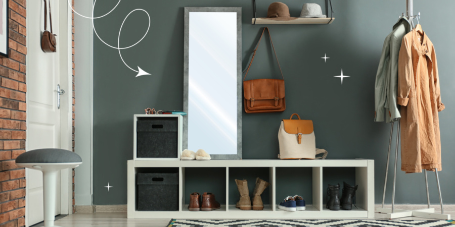 Поставте лавку, стілець або пуф — вони допоможуть зручно взуватися. Обов’язково повісьте дзеркало в повний зріст: воно не лише практичне, а й візуально розширює простір. Якщо не вистачає стін, дзеркало можна прикріпити просто на двері.
